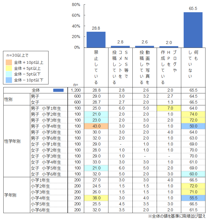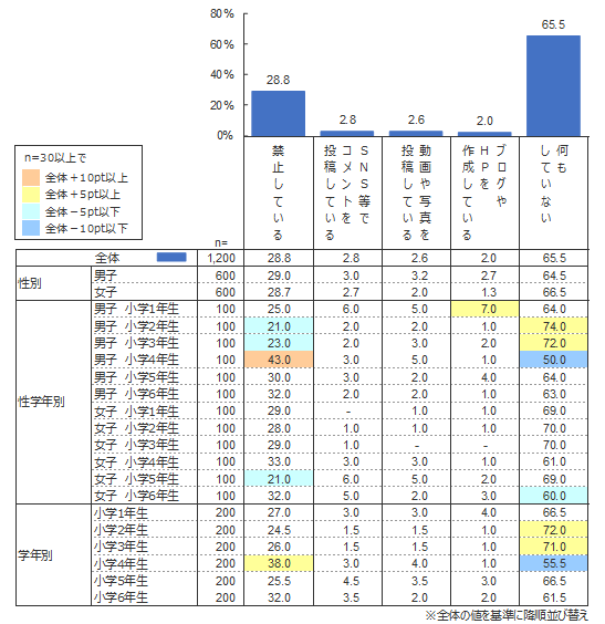 調査の結果、「何もしていない」(65.5%)が最も多く、(保護者が)「禁止している」(28.8%)が続いた。そして「SNS等でコメントを投稿している」(2.8%)や「動画や写真を投稿している」(2.6%)は少数という結果となった。過半数の小学生は通信機器の利用においては専らコンテンツを消費する立場であることがうかがえる。