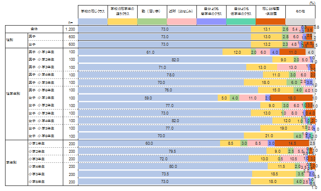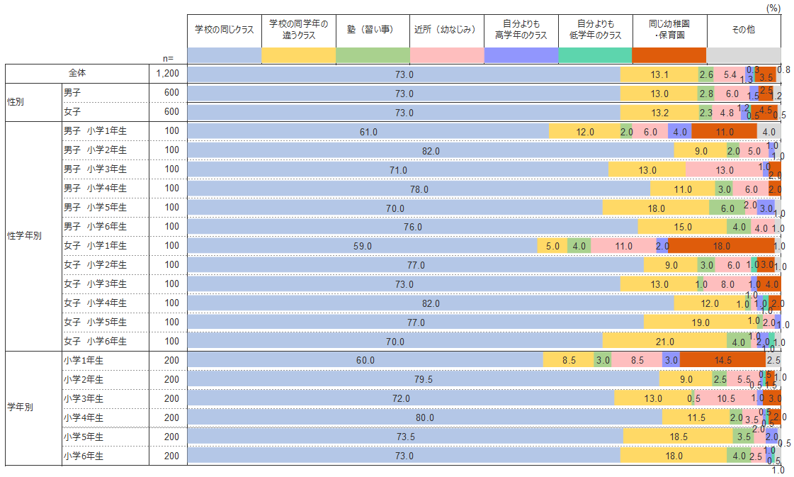 学年や男女に関わらず「学校の同じクラス」が最も多い結果となった。学年別にみると、1年生は「同じ幼稚園・保育園」が14.5%と、他学年より突出して多く、出身の幼稚園・保育園の友人と継続して付き合っている様子がうかがえる。学年が上がるにつれて「同じ幼稚園・保育園」の割合は一桁となり、高学年ではほぼみられなくなる。3年生以上になると「学校の同学年の違うクラス」の割合が二桁となり、高学年では18%を超える。これは元クラスメイトとの仲が続くものと考えられる。