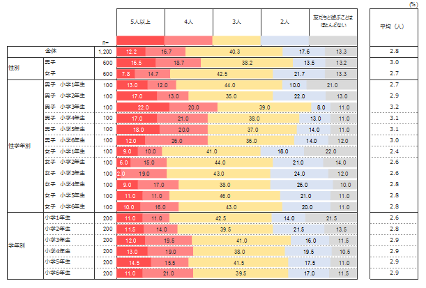 最も多い回答は「3人」(40.3%)であり、次いで「2人」(17.6%)、「4人」(16.7%)、「5人以上」(12.2%)となるが、「友だちと遊ぶことはほとんどない」が13.3%と低くない割合を示している。