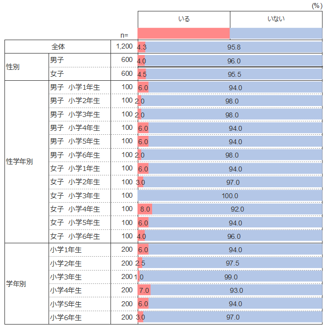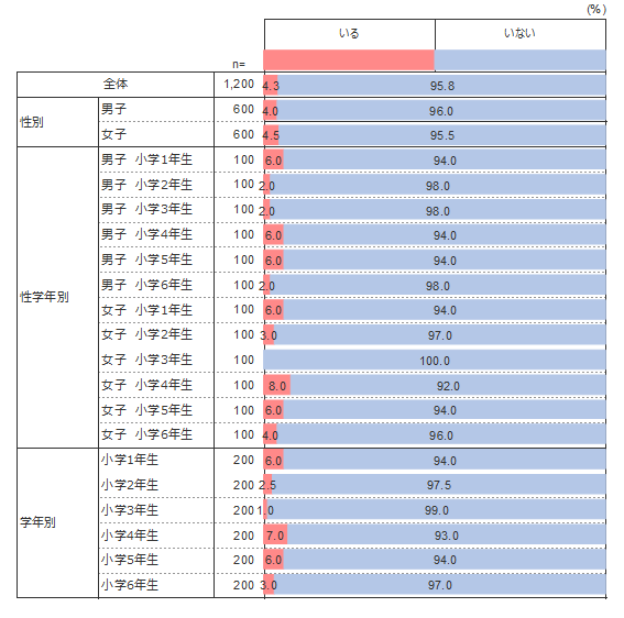 学年別に見ると、1年生が6.0%とやや高く、その後割合は下がる。まだ「恋人」という概念が1年生では仲のよい友だちの延長であり、また男女とも仲良く接している時期であるため、「いる」と答えた子どもが多い可能性がある。
