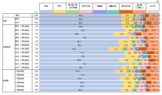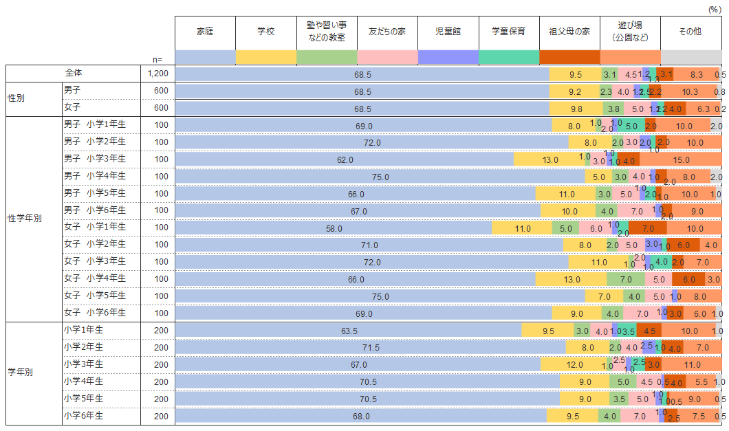 「家庭」が一番好きと答えた子どもは全体で68.5%と、ダントツであった。「家庭」と「祖父母の家」を合わせた、いわゆる身内の場所が好きな子どもは71.6%、「その他」を除く「学校」「塾や習い事などの教室」「友だちの家」「児童館」「学童保育」「遊び場(公園など)」といった社会的な場所が好きな子どもは27.9%と、家庭的な場所を選ぶ子どもを下回る結果となった。社会的な場所の中では「学校」(9.5%)が最も多く、次いで「遊び場(公園など)」(8.3%)、「友だちの家」(4.5%)となった。学年が高いほど「友だちの家」が好きと答える子どもが多くなる傾向がみられた。成長するにつれて、友だちなどの家庭外の他者との関係がより広がる様子がうかがえる。