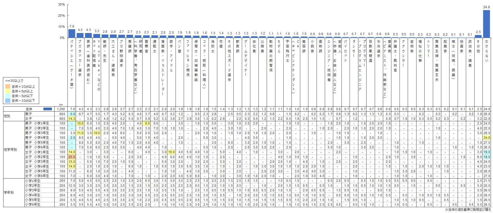 つきたい職業1位は毎年人気の「パティシエ(ケーキ屋)」(7.6%)、2位「プロサッカー選手」「医師(歯科医師含む)」(4.3%)、3位「YouTuberなどのネット配信者」(3.3%)となった。今年の調査で特筆すべきは「YouTuberなどのネット配信者」が4位に入ったことといえよう。女子のみのランキングでは19位(1.2%)である一方、男子で見ると2位(5.5%)の人気であった。子どもたちが日頃YouTubeなどの動画サイトに親しみ、そこで活躍している配信者を見て憧れを抱く姿がうかがえる。職業という概念が変化していく中、今後、このような新しいスタイルの職業を小学生がどのように志向するのかを注視していく必要があるだろう。