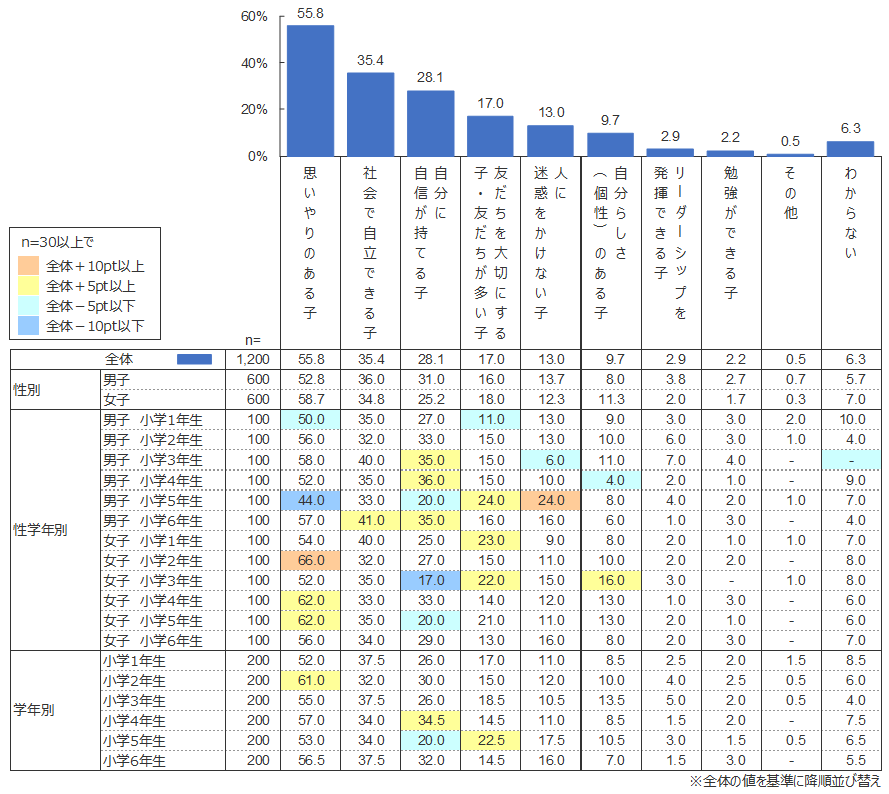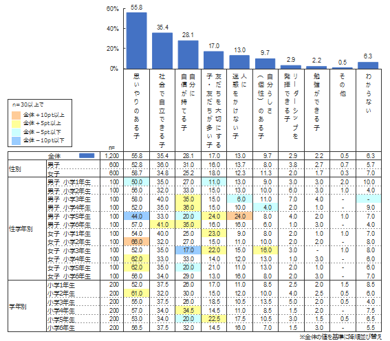 男女別では多少の差があるものの、男女ともすべての項目に対して順位は同じであった。男女間の比較において顕著な差がついた項目は、「リーダーシップを発揮できる子」について男子が女子の倍近く選ばれていることや、「勉強ができる子」について男子が女子の約1.6倍であったことなどが挙げられる。一方、女子の方が多い項目としては、男子の約1.4倍である「自分らしさ(個性)のある子」が目立った。また、「人に迷惑をかけない子」の12.3%に対し、「自分らしさ(個性)のある子」が11.3%と迫っており、とくに女子については、(もちろん両者は相反するものではないが)周囲と合わせることよりも、自分の個性を大切にして育ってほしいと考える保護者が一定数いるように見受けられる。
