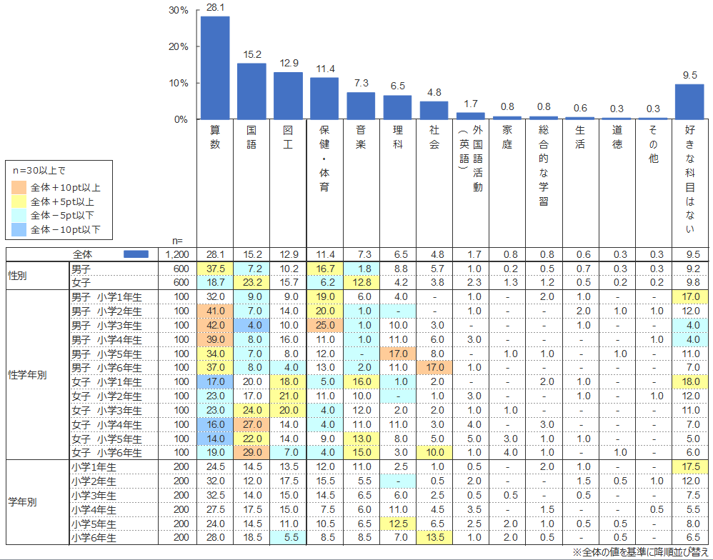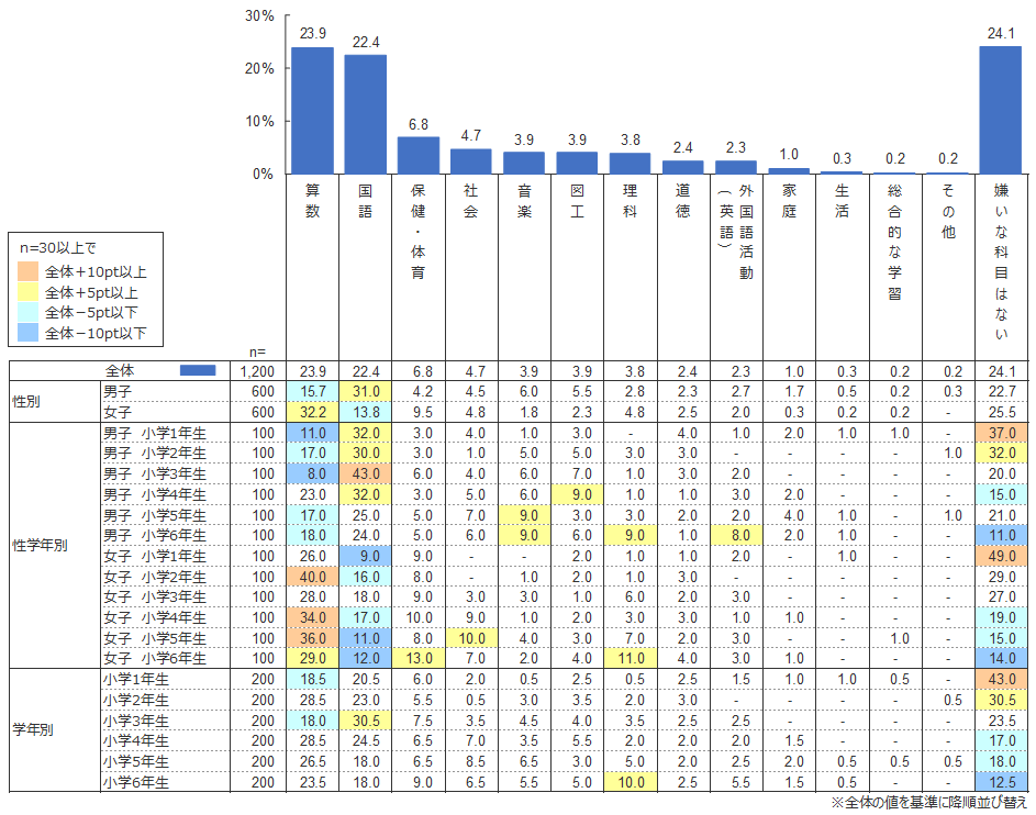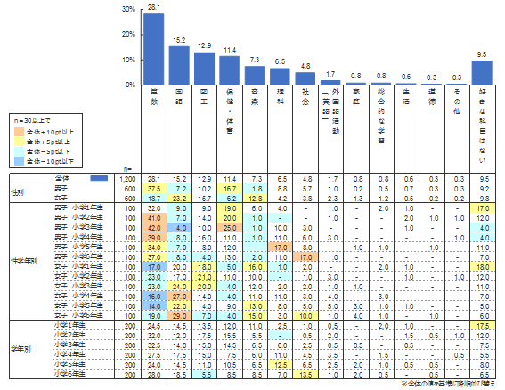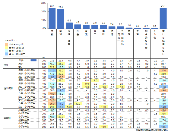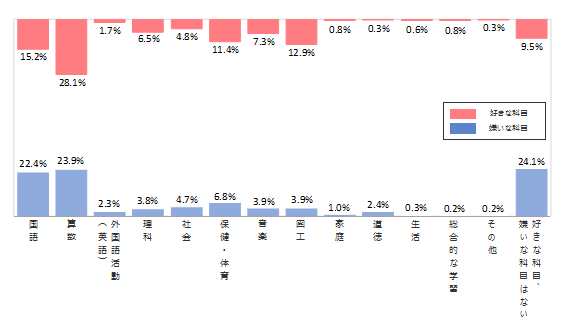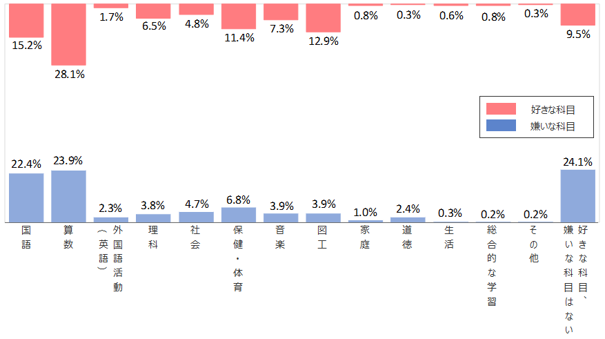 男女別に「算数」と「国語」に着目すると、男子の「好きな教科」は「算数」(37.5%)がダントツであり、「国語」は(7.2%)と5位であった。一方、女子の「好きな教科」1位は「国語」(23.2%)、2位が「算数」(18.7%)であった。「嫌いな教科」ではこれが逆転し、男子の1位は「国語」(31.0%)、2位が「算数」(15.7%)、女子では「算数」が1位で32.2%、2位が「国語」で13.8%であった。「算数」と「国語」は男女で好き・嫌いに逆転現象が生じている。