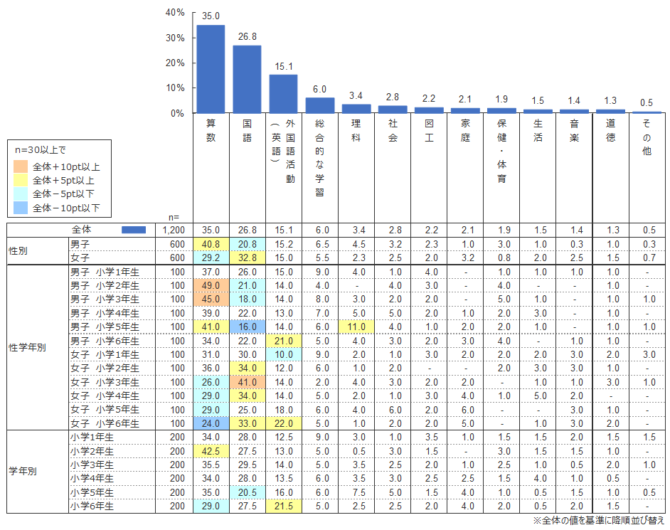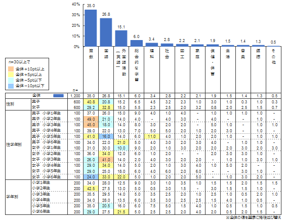 調査の結果、1位は「算数」(35.0%)、2位「国語」(26.8%)、次いで「外国語活動(英語)」(15.1%)という回答となった。「算数」と「国語」についての男女バランスは2016年度調査時 と大きな変化はなく、「算数」は女子より男子の方が11.6ポイント高く、「国語」は男子より女子の方が12ポイント高いことから、男女の認識が逆転していることがわかる。さらにこの傾向は低学年~中学年頃からみられ、教科に対する好き・嫌いの傾向とも重なっている。このことから、学ぶ内容を面白いと思うかどうかは、将来に向けたその後の学習意欲にも大きく影響することがうかがえる。