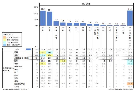 「国語」や「算数」、「理科」、「社会」に関しては、教科に対する好き・嫌いは「将来役に立つ」と思うか思わないかの結果とほぼ重なっていることが見て取れる。一方「外国語活動(英語)」に関してはその傾向は見られない。2020年度以降の「外国語活動(英語)」については、3年生からの必修化や5年生からの教科化といった影響による意識の変化に注目していく必要があるだろう。