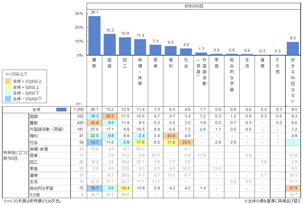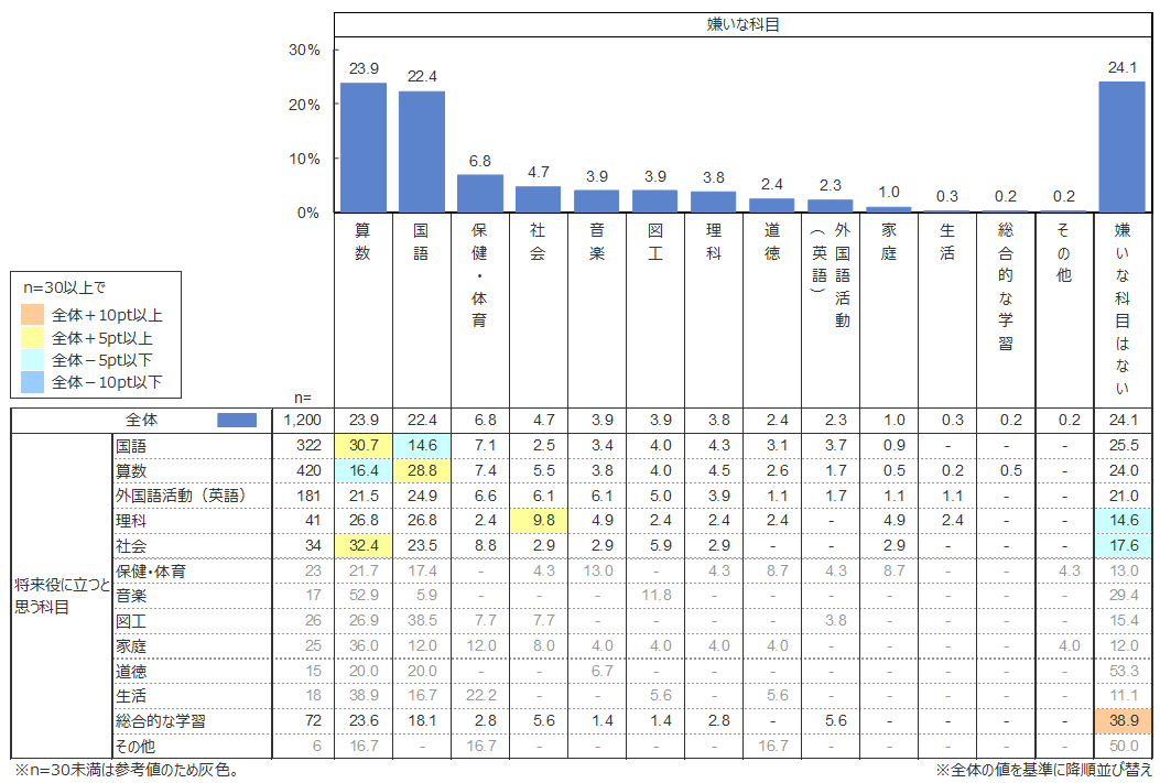 また、「嫌いな教科はない」子どもは「将来役に立つと思う教科」として「総合的な学習」を選ぶ割合が高いことがわかった。学習指導要領の改訂に伴い、教科の領域を超えた視点を持つ授業が増えることが予想されるため、それが「嫌いな教科はない」と答える子どもを増やすことにつながる可能性も考えられる。