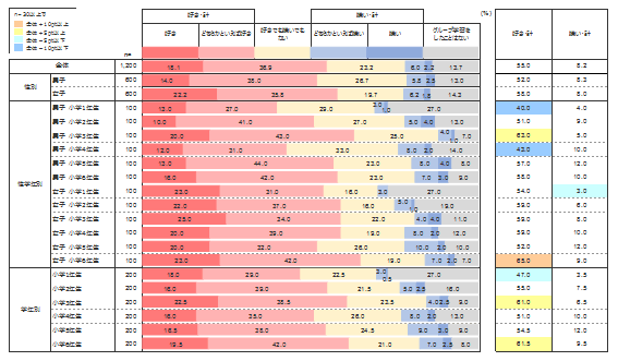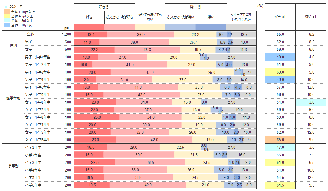 全体のうち「好き」と回答したのは18.1%で、以前に同様の質問を行った2015年度調査 の25.9%という割合から、7.8%減少している。また「グループ学習をしたことはない」子どもの割合が、2015年度調査の4.5%から3倍以上の13.7%に跳ね上がっている。この結果は、近年の教育改革の潮流とは逆行しているともみて取れる。なお、「好き」「グループ学習をしたことはない」以外の回答の割合については、2015年度調査とさほど変わらなかった。
