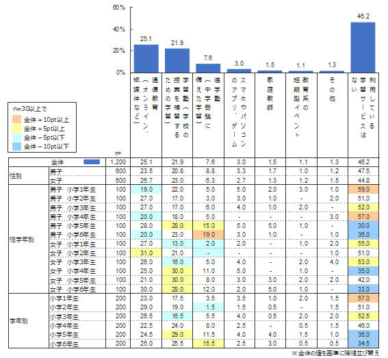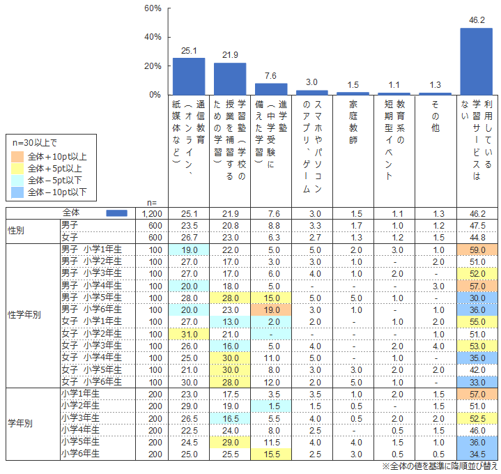 全体としては通信教育の割合が高く、全体平均では25.1%とおよそ4人に1人の小学生が利用していることがわかった。学年間の際立った特徴はみられないものの、男女別では女子の割合が若干高い。