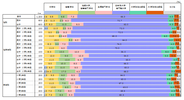 また、子どもの性別で比較した場合、「四年制大学・専門職大学」以上の進学を期待する保護者の割合は、男子では78.9%、女子では69.5%となっており、子どもの性別によって保護者の進学期待が異なっていることが分かる。2012年度の調査で同様の質問をしているが、大学以上の進学を期待する割合は、「第一子・男子」で78.7%、「第一子・女子」で67.4%であったことから、保護者が望む子どもの最終学歴に男女差が生じる傾向は6年前と同様であることがうかがえる。