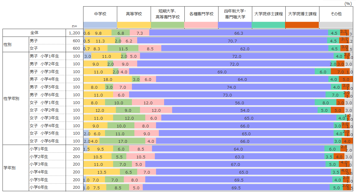 最も多いのが「四年制大学・専門職大学」(66.3%)で、「大学院修士課程」(4.5%)と「大学院博士課程」(3.3%)を含めると7割を超えることが分かった。多くの親が、子どもに「四年生大学・専門職大学」以上の教育を受けさせたいと考えていることが分かる。小学6年生の保護者を対象にした2012年度の調査の小学生白書と比較しても、その数値に大きな変化はない。