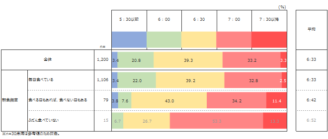 結果は2018年調査の高校生と同様、朝食を「毎日食べている」小学生(92.2%)の96.7%は、7:30前に起床していることが分かった。また、朝食を「毎日食べている」小学生の平均起床時刻は6:33であるのに対し、「食べる日もあれば、食べない日もある」小学生は6:42、「ふだん食べていない」小学生は6:52と、起床時刻が遅くなっていく。