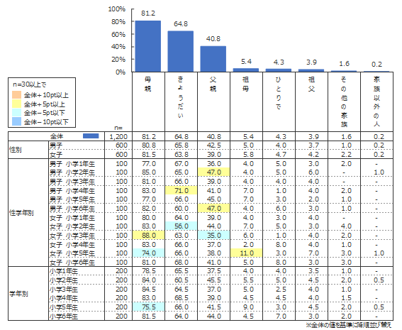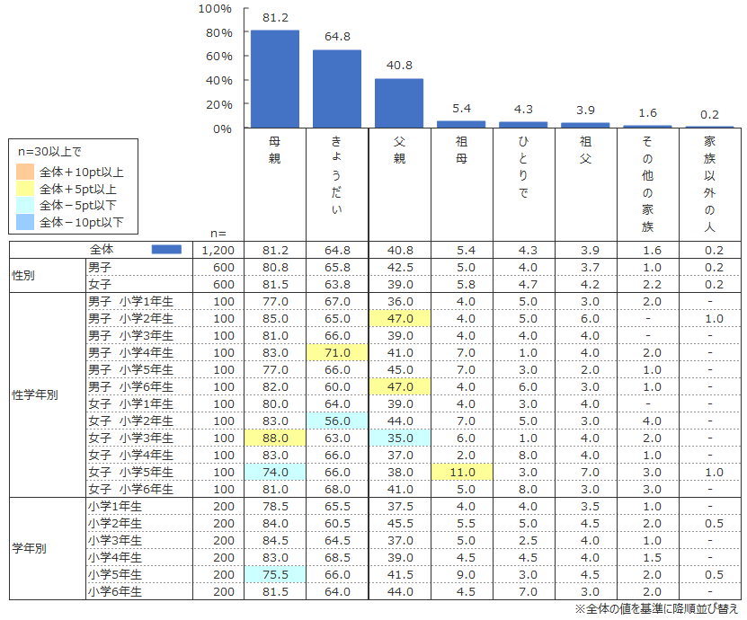 結果を見ると、1位「母親」(81.2%)、2位「きょうだい」(64.8%)、3位「父親」(40.8%)となっている。母親が有職かどうかによるところも大きいであろうが、父親と食事する割合と比較すると約2倍の差があり、その傾向は性別・学年に関わらない。