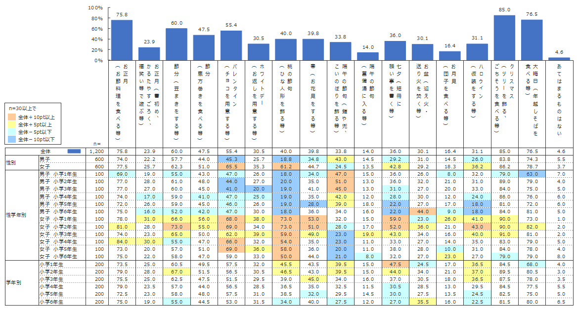 結果を見ると、最も多いのが「クリスマス(ツリーを飾る・ごちそうを食べる等)」(85.0%)、次いで「大晦日(年越しそばを食べる等)」(76.5%)、「お正月(おせち料理を食べる等)」(75.8%)となった。1年の終わりと始まりの行事でもある「大晦日」「お正月」は各家庭でも重要視されているが、それ以上に、ごちそうやプレゼント等の楽しみがある「クリスマス」は、家族みんなで楽しめるイベントとして強く意識されているようである。