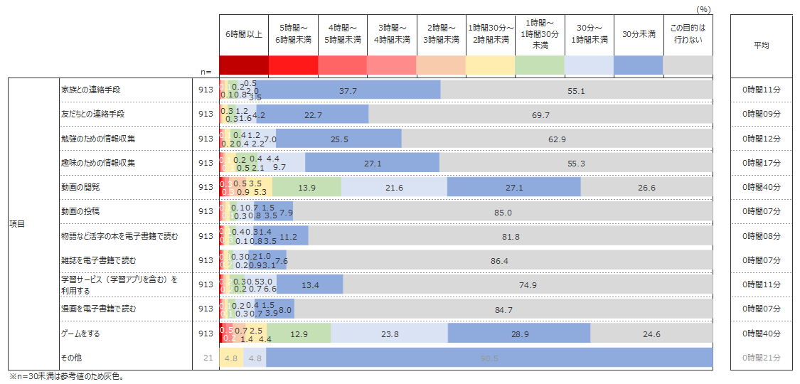 1日に少しでも通信機器の利用に時間を費やしている小学生の割合(全体から「この目的は行わない」を除いた数値)を見ていくと、「ゲームをする」(75.4%)、「動画の閲覧」(73.4%)が突出して多いことがわかる。この2つの項目において大半の小学生は「30分未満」「30分~1時間未満」を選択しているものの、「1時間以上」費やしている割合も「ゲームをする」(22.7%)、「動画の閲覧」(24.7%)共に他の項目よりも高いことが分かる。