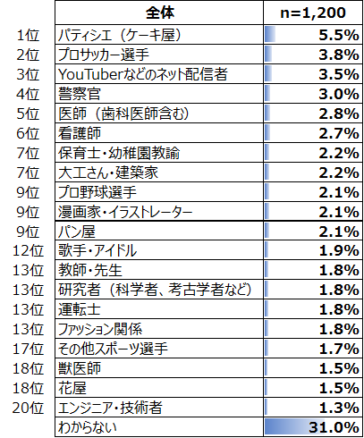 身近な職業人をモデルに、将来なりたい職業を想像することは珍しくないと思われるが、小学生が日常的に接する職業である13位「教師・先生」でも、男子0.8%、女子2.8%と開きがあるのは興味深い。