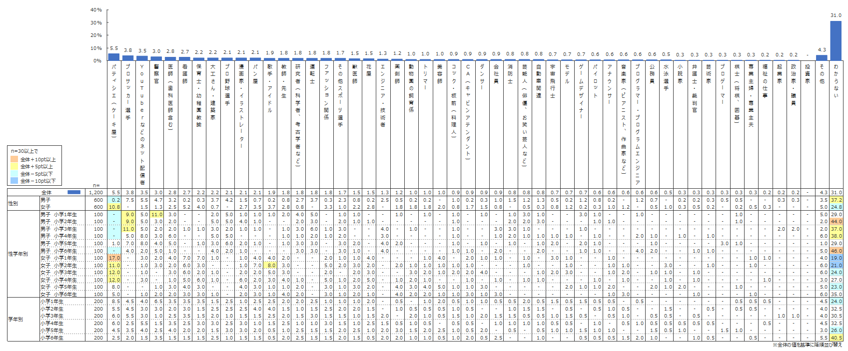 1位の「パティシエ(ケーキ屋)」(5.5%)を男女別(図22参照)に見ると、男子0.2%、女子10.8%と大きな差がある。2位「プロサッカー選手」(3.8%)は男子7.5%だが、女子の選択なし、3位「YouTuberなどのネット配信者」(3.5%)は男子5.5%、女子1.5%という内訳である。ちなみに、4位「警察官」(3.0%)は男子4.7%、女子1.3%である。5位「医師(歯科医師含む)」(2.8%)は男子3.2%、女子2.5%と、他の項目と比べると、男女による違いが小さめの結果となった。ただ、6位「看護師」(2.7%)は男子0.2%、女子5.2%とやはり差が開く。
