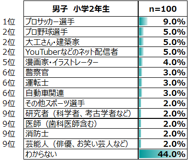 「警察官」「プロサッカー選手」「プロ野球選手」「運転士」「YouTuberなどのネット配信者」「大工さん・建築家」の6項目は、全学年男子で10位以内に入る人気の職業である。「エンジニア・技術者」は3年生以降からランクインし、6年生では3位となる。中学生男子の2017年度調査でも「エンジニア・技術者」は学年全体ランキング1位、2018年度の高校生白書でも全体ランキング3位に入るなど、人気は続いている。