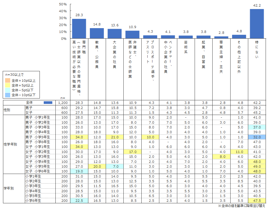 保護者が小学生の子どもに期待する職業として最も人気が高かったのは、「専門職」(28.3%)であることが分かった。ここでいう「専門職」は、専門資格や高い技術を必要とする職業を指すものであり、2位「教員、公務員」(14.8%)、3位「大企業の社員」(13.6%)と10ポイント以上の差がついた。4位の「弁護士・医師などの士師業」(10.9%)も含め、子どもに専門性や安定性を求める気持ちの表れと考えられる。