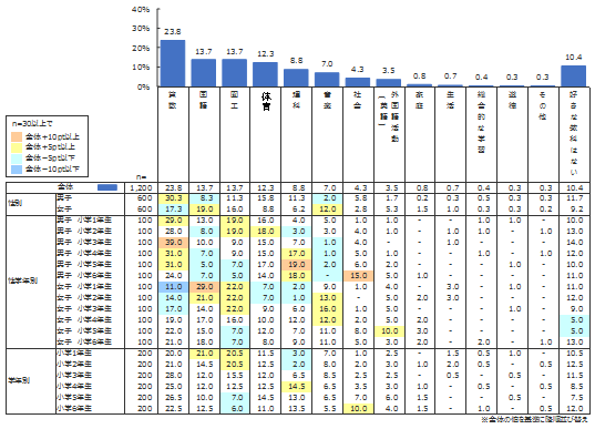 男女別に「算数」と「国語」に着目すると、男子の「好きな教科」は「算数」(30.3%)がダントツで1位であり、「国語」(8.3%)は5位であった。一方、女子の「好きな教科」1位は「国語」(19.0%)、2位が「算数」(17.3%)であった。「嫌いな教科」ではこれが逆転し、男子の1位は「国語」(29.5%)、2位が「算数」(15.8%)、女子は「算数」(32.5%)が1位、2位が「国語」(13.5%)であった。「算数」と「国語」は男女で好き・嫌いに逆転現象が生じている。