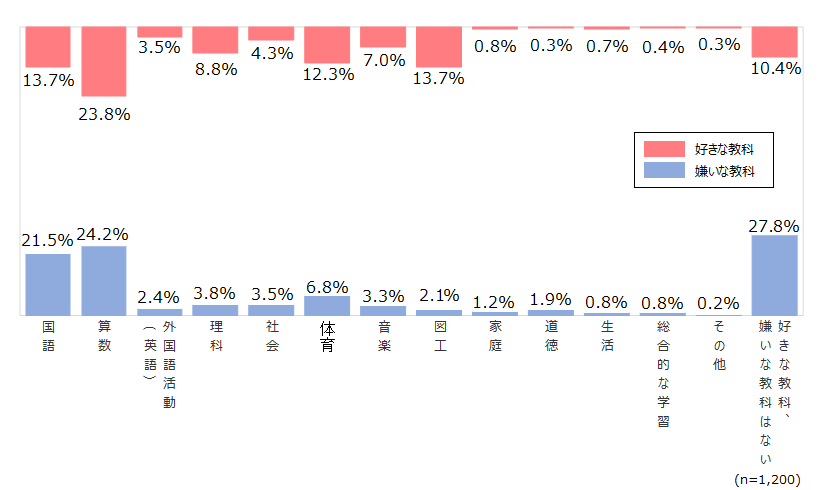 本調査では、6年連続で好きな教科・嫌いな教科共に「算数」が1位となった。良くも悪くも、小学生に“注目”されている教科といえる。好きな教科は、1位「算数」(23.8%)、2位「国語」「図工」(同率13.7%)、4位「体育」(12.3%)の順であり、1位と2位の差は10.1ポイントと大きい。嫌いな教科は、1位「算数」(24.2%)、2位「国語」(21.5%)、3位「体育」(6.8%)、4位「理科」(3.8%)となった。