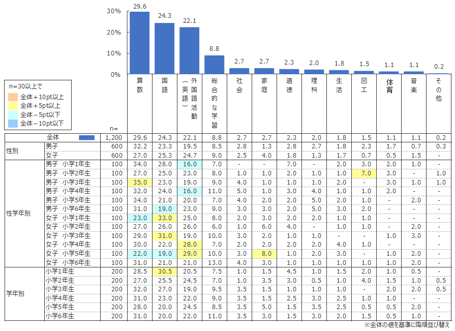 調査の結果、1位「算数」(29.6%)、2位「国語」(24.3%)、3位「外国語活動(英語)」(22.1%)は、4位「総合的な学習」(8.8%)以下と大きな差がつく結果となった。「算数」を選んだ割合は、女子より男子の方が5.2ポイント高い。一方「国語」は男子より女子の方が2ポイント高く、「外国語活動(英語)」も男子より女子の方が5.2ポイント高い。この3教科は「将来役に立つ」と考えられる点で上位だが、男女別では認識に差が見られる。「算数」「国語」については、2017年度の調査と比べて男女のバランスに変わりはないが、そのポイント差は縮まっている。この傾向は低学年~中学年頃から見られ、教科に対する好き・嫌いの傾向とも重なっている。