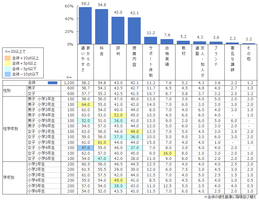学年別に見ると、学年が上がるにつれて「家からの通いやすさ」は次第に下がっていく傾向にある。低学年では通塾への安全性がより求められているようだ。また、「料金」も学年が上がるにつれ僅かではあるが下がっていく傾向が見られる。高学年になると「料金」に対する意識のハードルが少し下がるようだ。