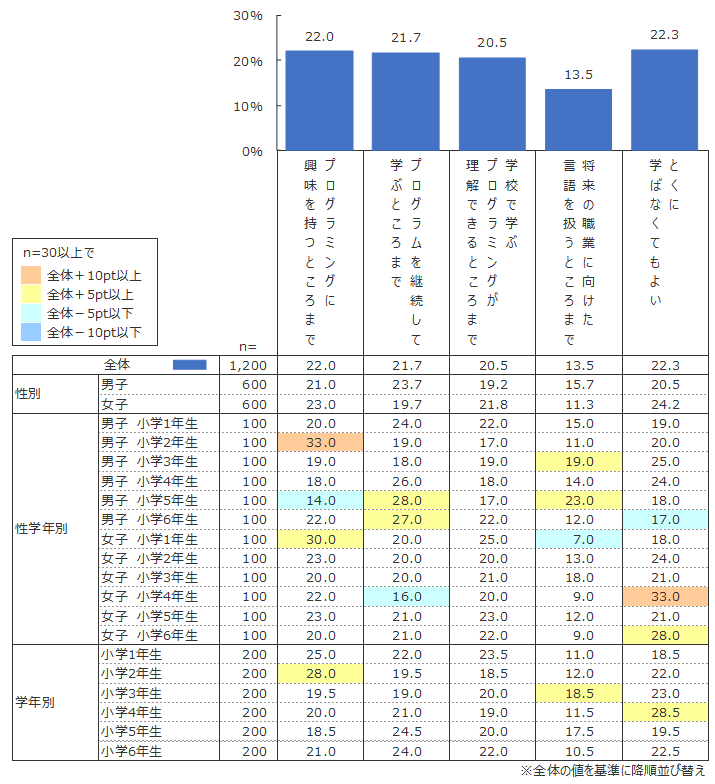 さらに、最も高い割合だったのは「とくに学ばなくてもよい」(22.3%)である。既に授業に取り入れている学校があったり、人気の習い事になったりと、一部では盛り上がりを見せているが、「プログラミングを学ぶ」ことの意義や具体的な内容など、保護者にはまだ十分に浸透していないことが分かる。