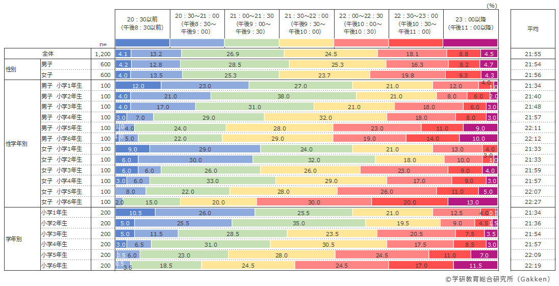 注目すべきは、22:00以降に就寝する割合が小学6年生全体で53%と過半数を超えている点である。特に小学6年生女子は63%が該当しており、男子の43%とは20ポイントの差がある。