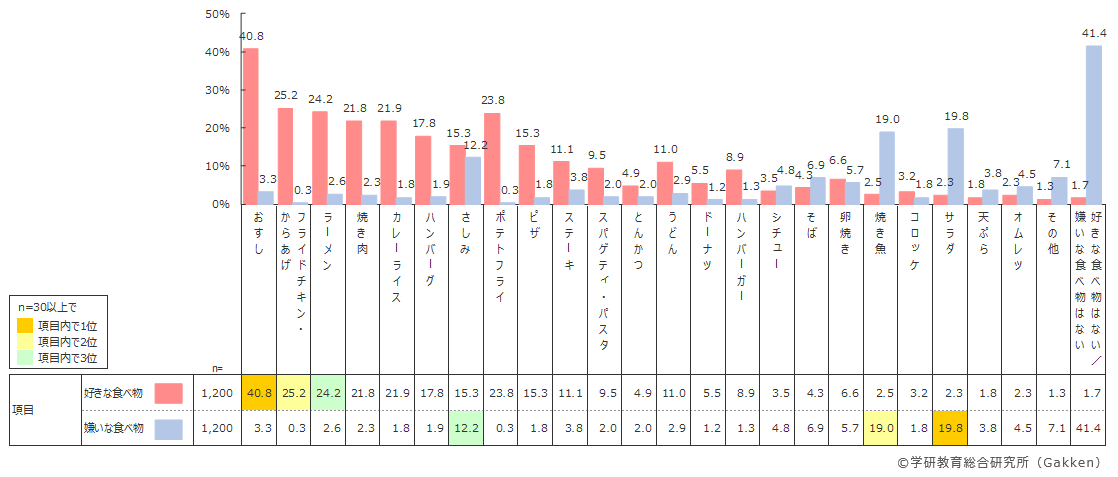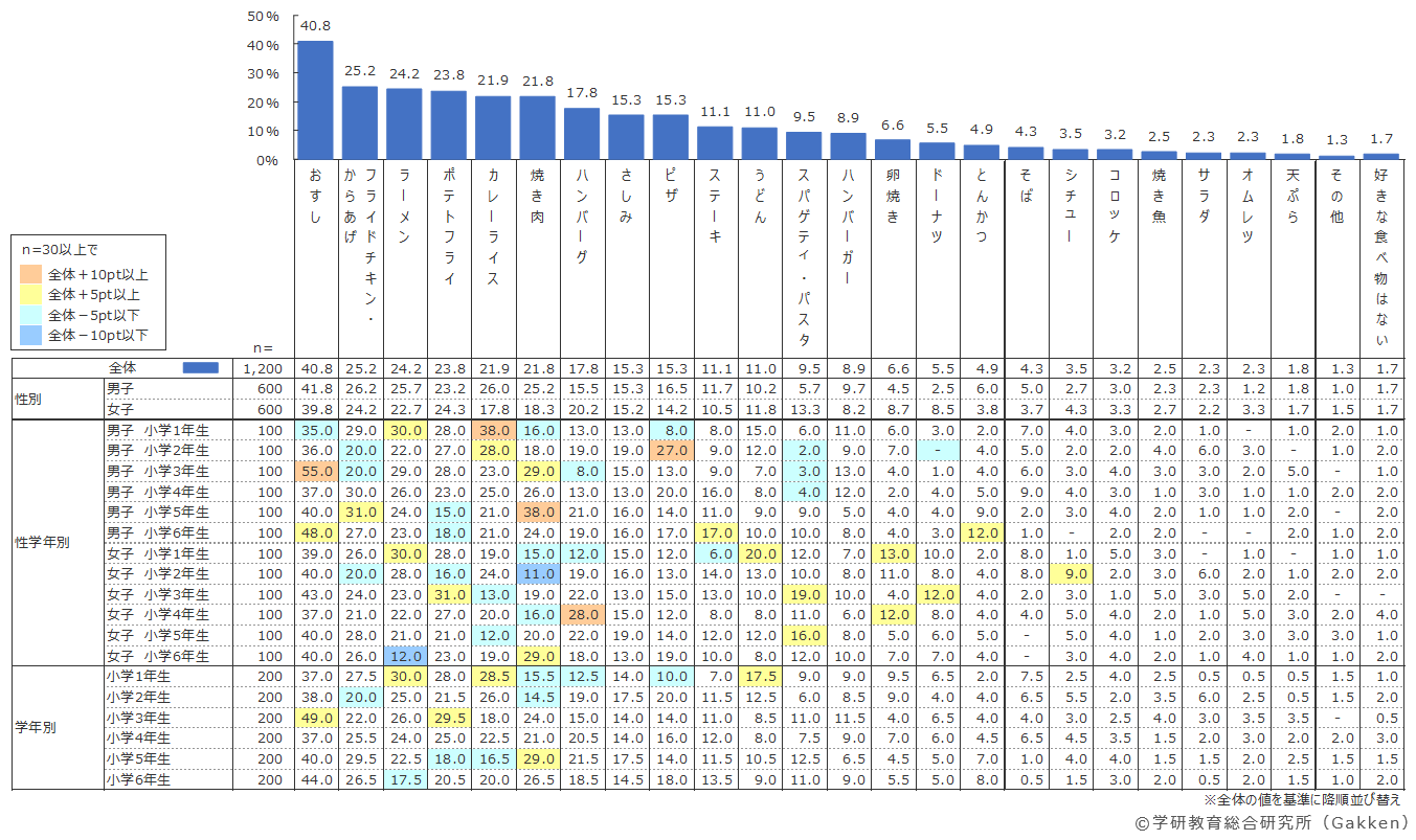 今回の調査結果は、好きな食べ物1位は「おすし」(40.8%)、2位は「フライドチキン・からあげ」(25.2%)、3位は「ラーメン」(24.2%)となった。1989年度調査でも1位は「おすし」であったが、当時の33.5%から40.8%に飛躍的に伸びている。回転寿司店の増加により、30年前よりも気軽に寿司を楽しめるようになったことが影響しているのだろうか。