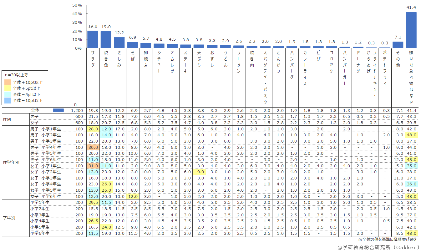 また、嫌いな食べ物は、1位「サラダ」(19.8%)、2位「焼き魚」(19.0%)、3位「さしみ」(12.2%)となり、1989年当時の嫌いな食べ物1位「焼き魚」(40.5%)が、大きく減少した結果となった。