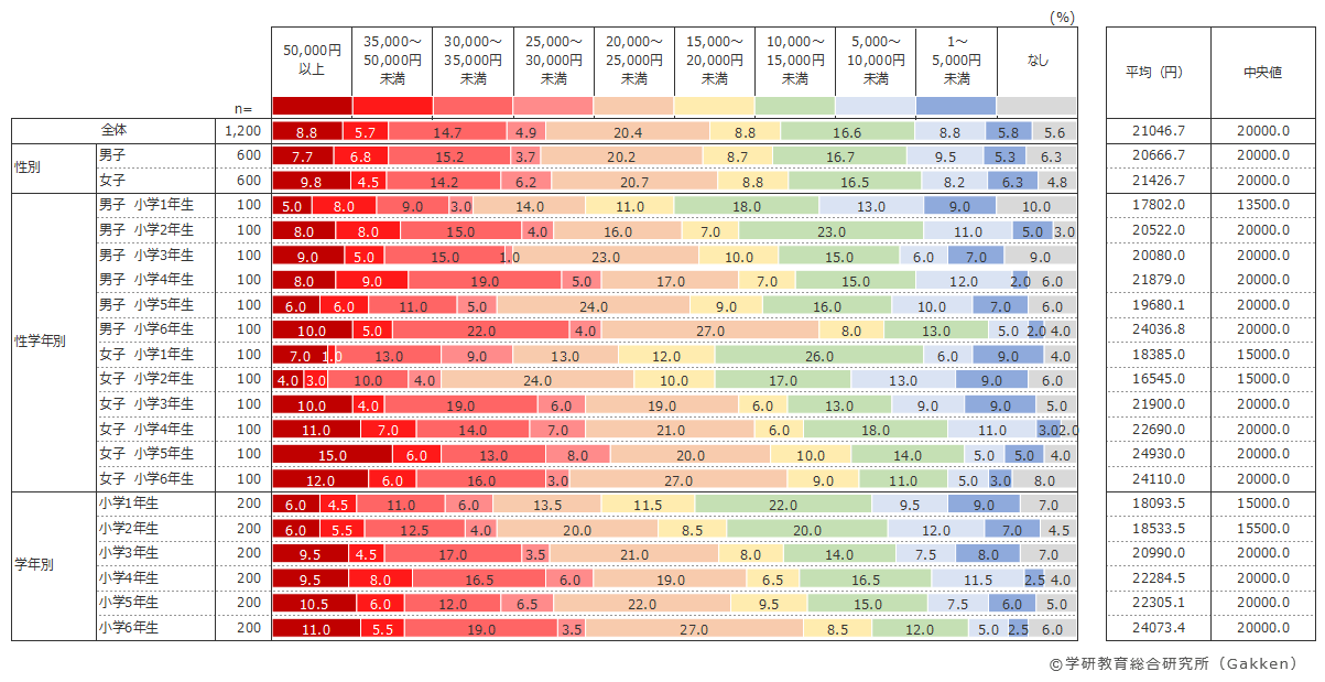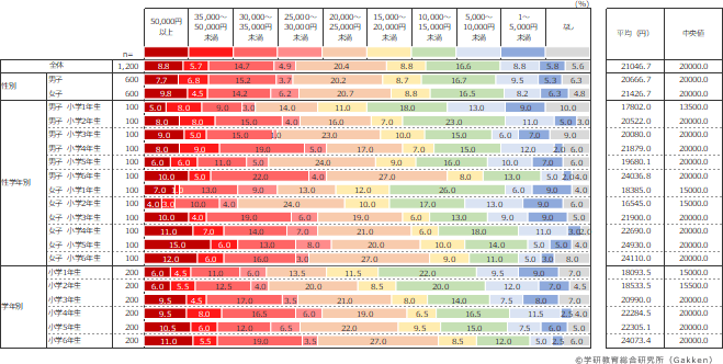 調査の結果、お年玉を「もらっている」と回答した子どもは全体の94.4%となり、その平均総額は約21,047円であった。過去の平均総額を見ると、2016年度調査時は約19,056円、2017年度調査時は約19,386円と、わずかながら増加傾向にあったが、2019年でその額は急増したと言える。特に、2017年度調査時と比較した増加率は、小学1年生が3.5%であるのに対し、6年生は12.5%と大きく、高学年での金額増が目立つ。