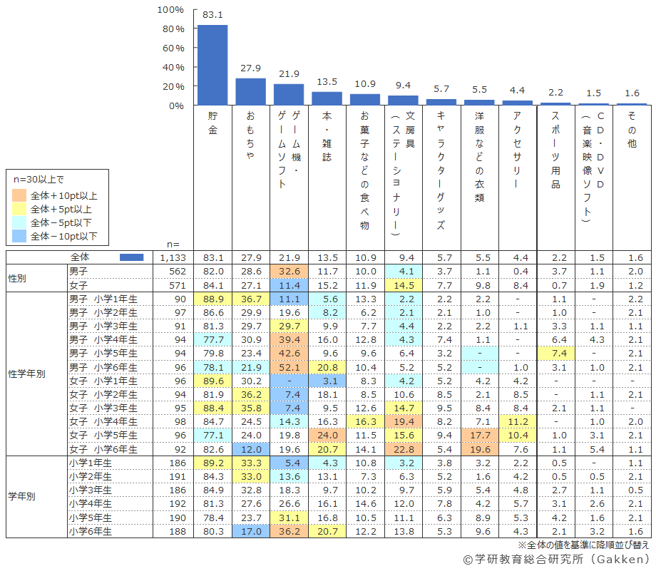 「貯金」(83.1%)がダントツの1位で、次いで「おもちゃ」(27.9%)、「ゲーム機・ゲームソフト」(21.9%)の順となった。男女別だと、男子では「ゲーム機・ゲームソフト」が32.6%(女子11.4%)、女子では「文房具(ステーショナリー)」が14.5%(男子4.1%)と、その用途に大きな違いが見られる項目もある。