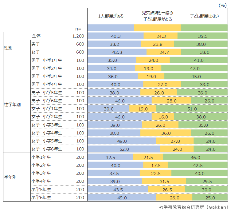 「1人部屋がある」と答えたのは全体の40.3%で、「兄弟姉妹と一緒の子ども部屋がある」(24.3%)と合わせると、約65%の子どもが何らかの形で子ども部屋を持っていることが分かった。