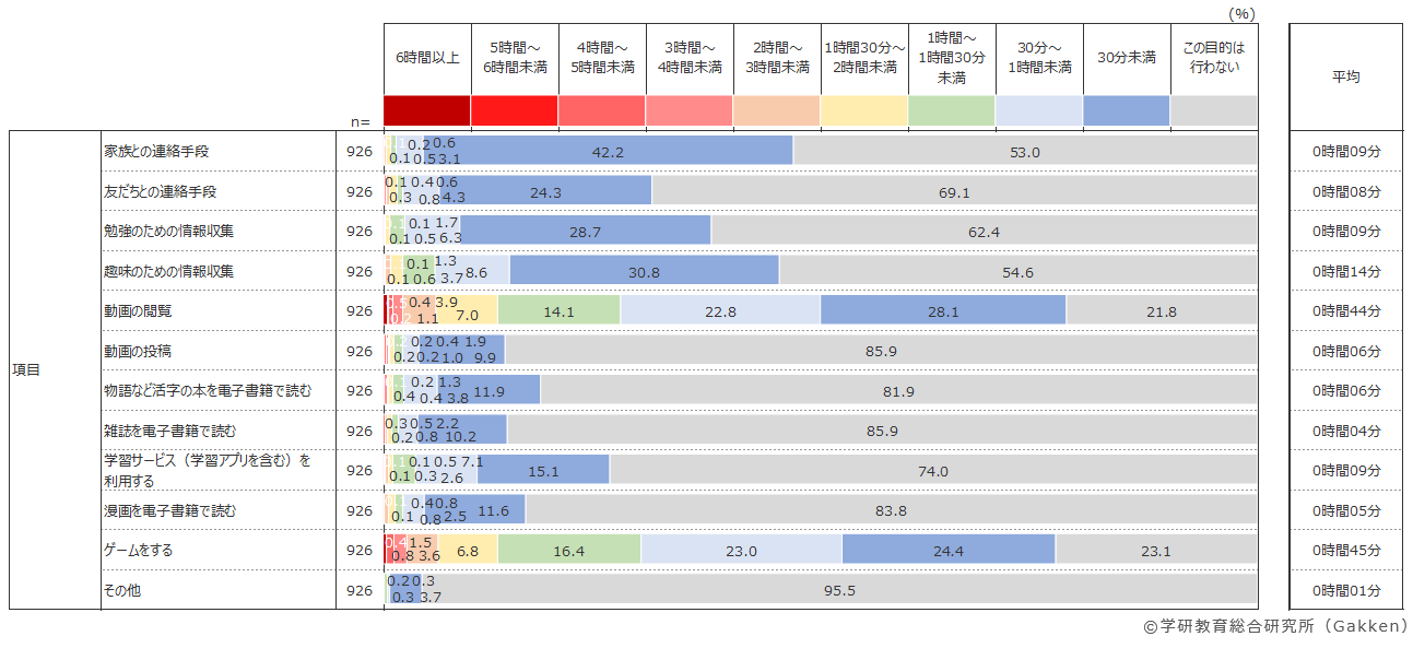 「自由に使える通信機器」調査で通信機器を使っていると答えた926人(小学生全体の77%)に対し、利用目的ごとに費やす1日の時間を聞いた。