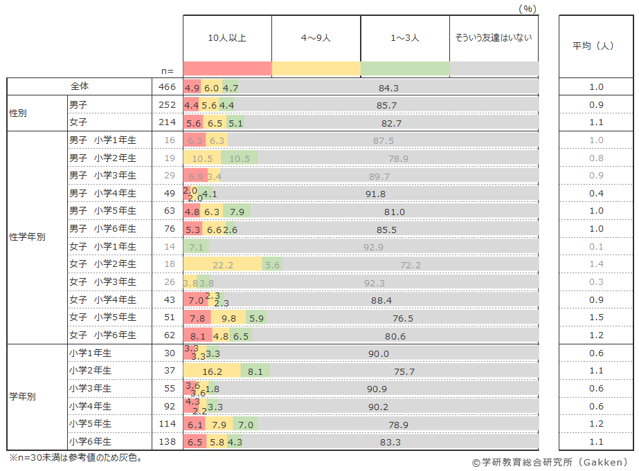結果を見ると、「そういう友達はいない」(84.3%)が最も多いことが分かった。学年ごとの特徴的な変化は見られないが、SNSが子ども達にも浸透している昨今では、今後ネット上だけの関係性が増えていく可能性が十分に考えられる。中学、高校と進学するに伴い、この結果がどのように変化するのかは興味深い。