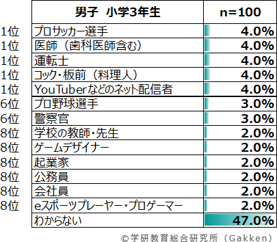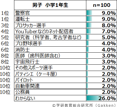 「将来つきたい職業」は、男女差が顕著に表れる項目である。男子だけのランキングはどのような結果になっているのだろうか。