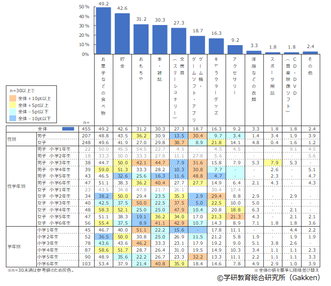 1位は「お菓子などの食べ物」(49.2%)、2位が「貯金」(42.6%)、 3位が「おもちゃ」(31.2%)であった。この上位3位は、2019年度調査と変化はなく、以下の順位も昨年と大きな変動はみられない。