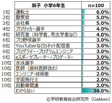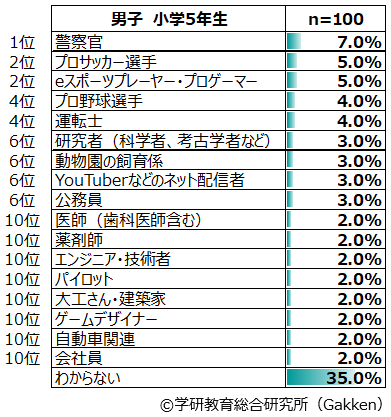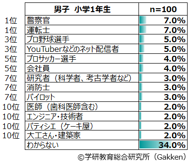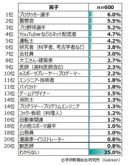 1位から5位までが「プロサッカー選手」、「警察官」「プロ野球選手」「YouTuberなどのネット配信者」「運転士」で占められるのは2018年以降変わらない。2019年度調査で「YouTuberなどのネット配信者」が本調査開始以降初めて男子ランキング1位となったが、今年は4位(4.7%)に落ち、2010年~2018年に1位を続けていた「プロサッカー選手」(6.0%)が返り咲きする結果となった。