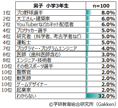 「将来つきたい職業」は、男女差が顕著に表れる項目である。では、小学生男子は将来どんな職業につきたいと思っているのだろうか。