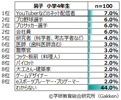 一方、順位に急上昇がみられるのは、10位「eスポーツプレーヤー・プロゲーマー」(2.2%)である。2019年は23位であったが、2020年は4年生(8位)、5年生(2位)、6年生(6位)と高学年で人気が高い。しかし1日の中でゲームをする時間についての調査結果を見ると、2020年は46分となっており、2019年度調査時の45分、2018年度調査時の40分と比べて劇的に増えたということはない。