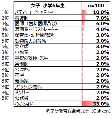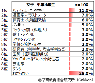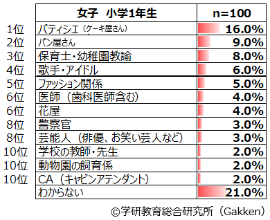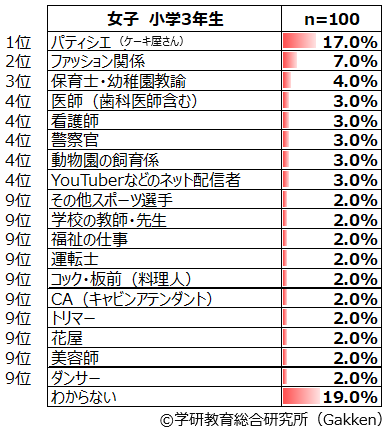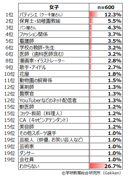 小学生女子に圧倒的に人気なのが「パティシエ(ケーキ屋さん)」である。全学年を通して1位であり、女子の全体ランキングでは12.3%である。この学年を問わない人気の高さは2001年度調査から続いている。特に、1~3年生では2位と比べると倍近いポイント差がある。しかし、5年生では「看護師」「保育士・幼稚園教諭」が同率1位(7.0%)になるなど、高学年では低学年ほど大きな開きはなくなっていることがわかる。