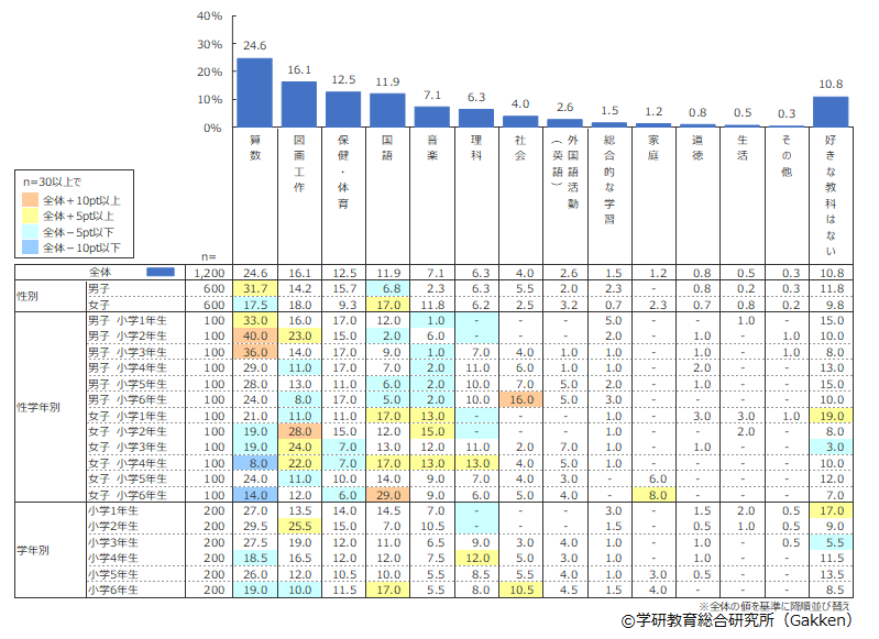 「好きな教科」の1位は「算数」(24.6%)、2位は「図画・工作」(16.1%)となり、2018年度調査、2019年度調査と同じ結果となった。男女別でみると、「算数」は、男子31.7%、女子17.5%と、14%ポイントの開きで男子の人気が高い。一方、「図画・工作」は男子14.2%、女子18.0%と女子の割合が高く、「国語」は、男子6.8%、女子17.0%と女子が大幅に上回る。この傾向は、2018年度調査、2019年度調査と同様である。