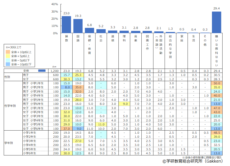 「嫌いな教科はない」割合が全体で29.4%を占め、好き嫌いなく勉強をする小学生が約3割いることがわかる。しかし学年別でみると、1年生の48.5%と約半数は「嫌いな科目はない」と答えているが、学年が上がるにつれてその割合に減少傾向がみられ、6年生になると13.0%にまで落ち込む。高学年になるにつれ、教科に対して苦手やつまづきを感じる小学生の割合が高まることがうかがえる。