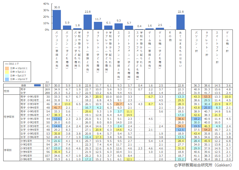 この結果から、たとえ子どもが専用で使えるスマートフォンがあっても、小学生のオンライン学習にスマートフォンを選択する家庭は少数で、小学生のオンライン学習には画面の大きい通信機器が選ばれていることがわかる。