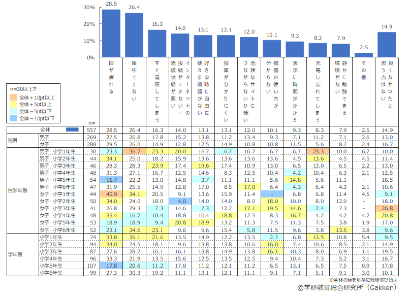 1位「目が疲れる」(28.5%)は男女ともにトップであったが、学年別で見ると、中学年・高学年と比較して低学年の回答率がやや高い。一般的に学年が上がるにつれテレビやスマートフォン、パソコンなどの画面との接触時間が長くなる傾向にあるなか、低学年の小学生にとってはオンライン学習の導入によって画面接触時間が急激に増えたケースが多かった、ということの表れだろうか。