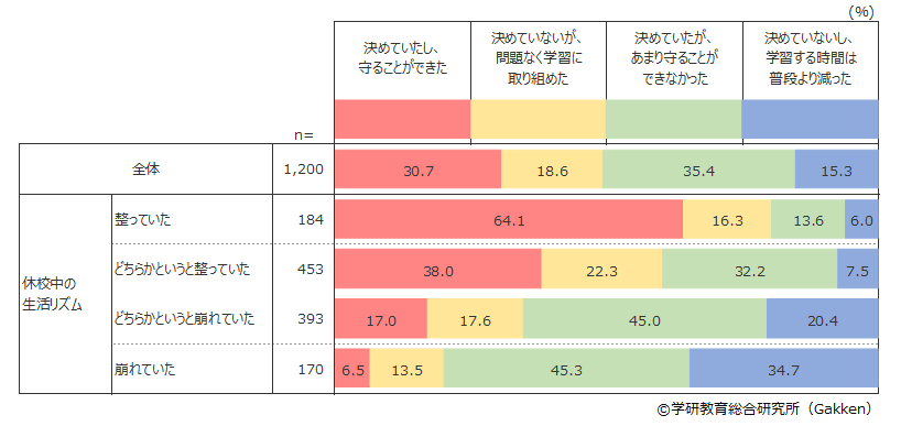「学習に取り組めた」という観点で見てみると、休校中の生活リズムが「整っていた」の回答者は、休校中の学習管理を「決めていたし、守ることができた」、「決めていないが、問題なく学習に取り組めた」の回答が合わせて最も多く、80%を超えている。対して、休校中の生活リズムが「崩れていた」割合は、前出の二つの割合を合わせても20%であった。この結果から、生活リズムの乱れと学習管理ができるかどうかには相関がみられることがわかる。