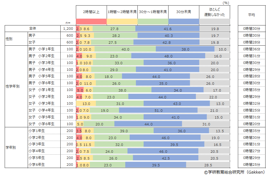 「子どもにとってスポーツは、生涯にわたってたくましく生きるための健康や体力の基礎を培うとともに、公正さと規律を尊ぶ態度や克己心を培うなど人間形成に重要な役割を果たすものである。」と文部科学省のHP(※1)に掲載されており、小学生の健康、精神面の成長において運動時間はとても重要な要素である。新型コロナウイルス感染拡大の影響に伴う休校措置の中、小学生はどの程度運動していたのだろうか。