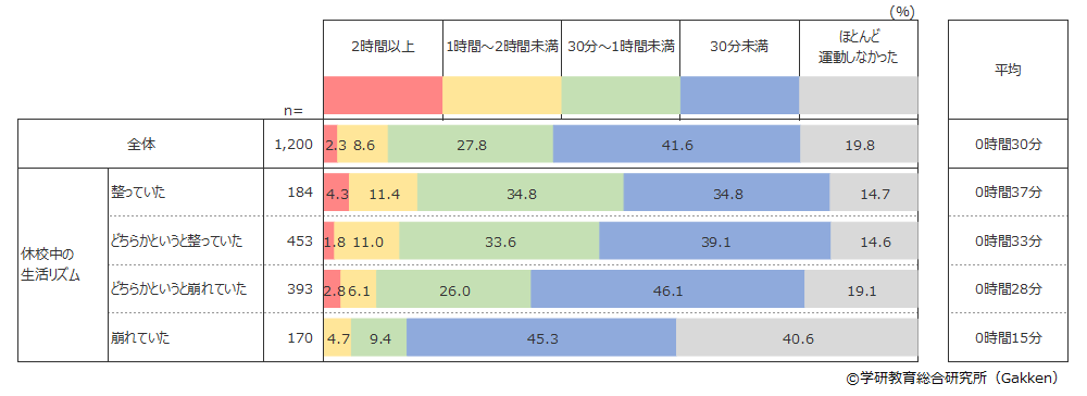 さらに平均時間をみても、「整っていた」、「どちらかというと整っていた」小学生の1日あたりの平均運動時間が35分であるのに対し、「どちらかというと崩れていた」「崩れていた」小学生は21分と、約15分の開きがある点にもその差の大きさが現れている。