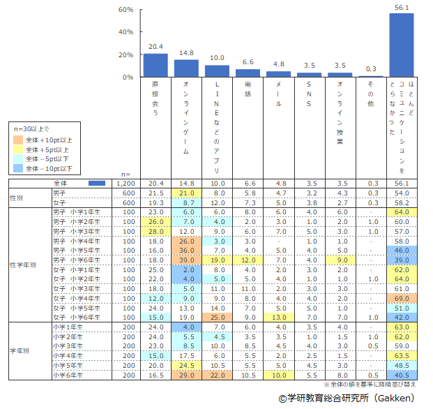 1位「ほとんどコミュニケーションをとらなかった」が56.1%と過半数以上であった一方で、2位「直接会う」も20.4%と高い結果となった。小学6年生では男女ともに「LINEなどのアプリ」が平均22%と高く、4年生以上の男子では26~39%が「オンラインゲーム」を通じて友だちとコミュニケーションをとっており、女子と比較して大きな差がある点が特徴である。